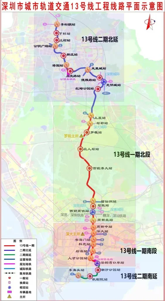 深圳地铁13号线北延线起自上屋站,止于光明区李松萌站,线路全长约19.25km,设站11座,车辆段1座,全部采用地下敷设。同时规划了未来与东莞地铁衔接的条件,计划2025年底全线通车。